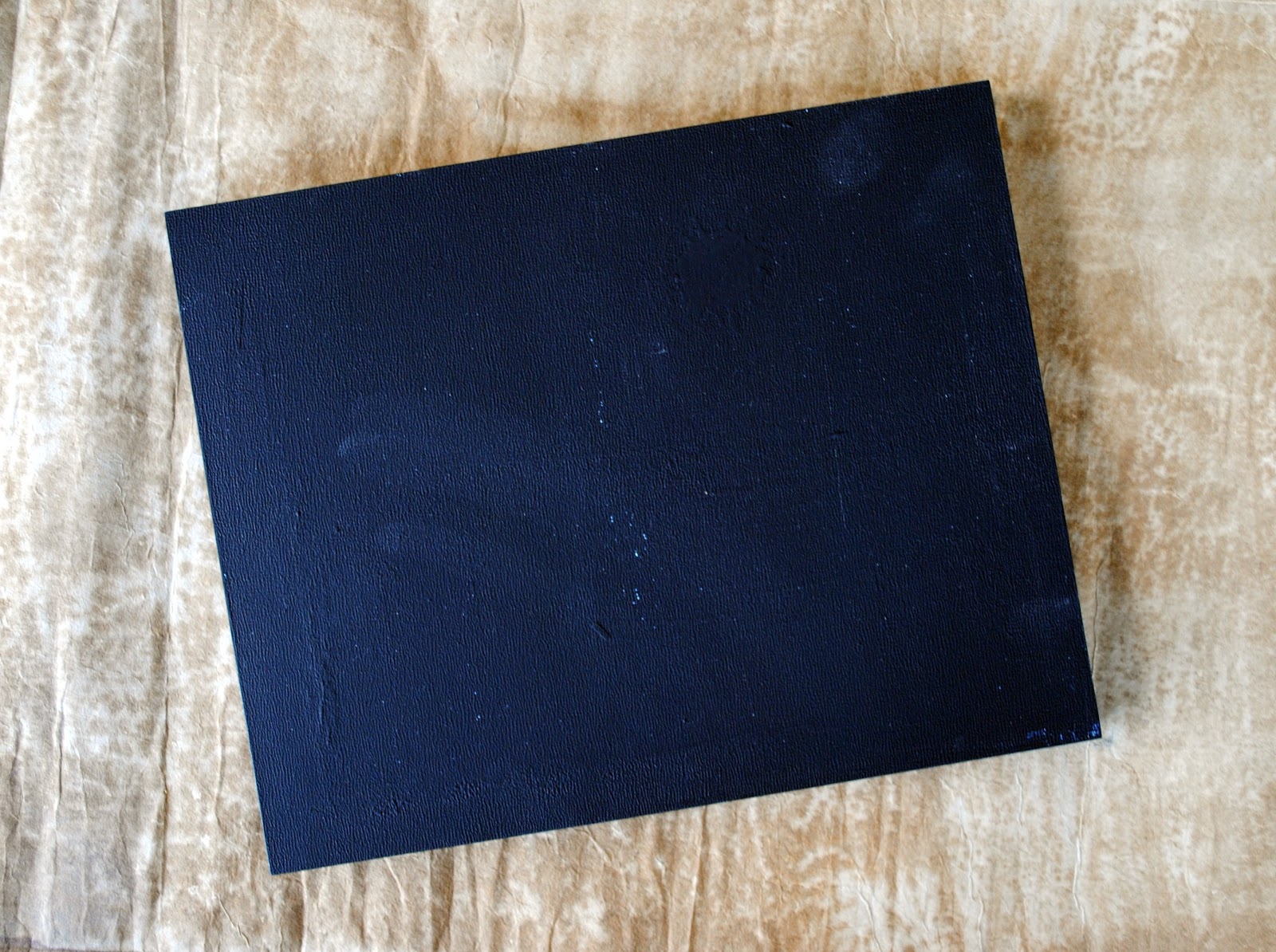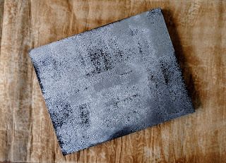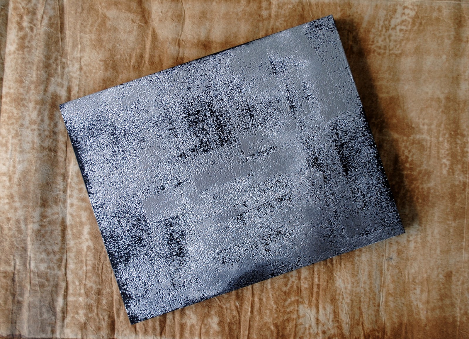 Chose a clear stamp with an abstract/splatter design and place on an acrylic block. Press into a watermark, embossing stamp pad and randomly stamp the design over the front of the panel. Pour the embossing powder over the panel until it covers entire surface. Tap off extra embossing powder. Heat surface until embossing powder melts.