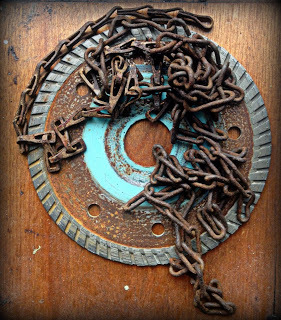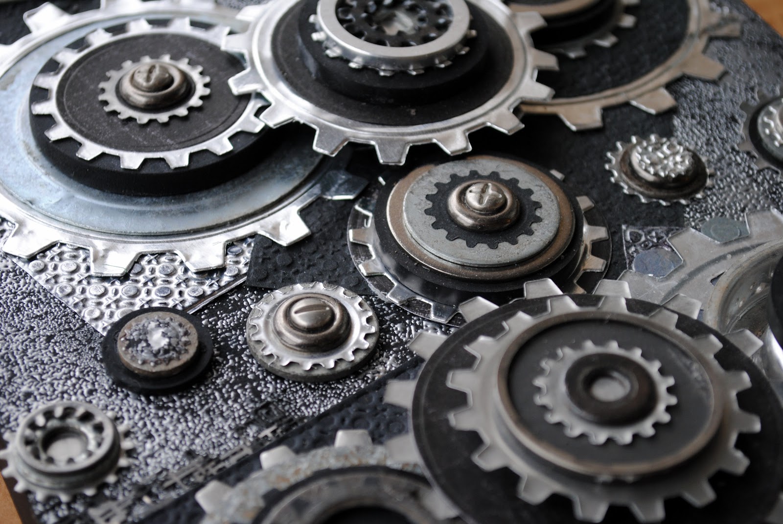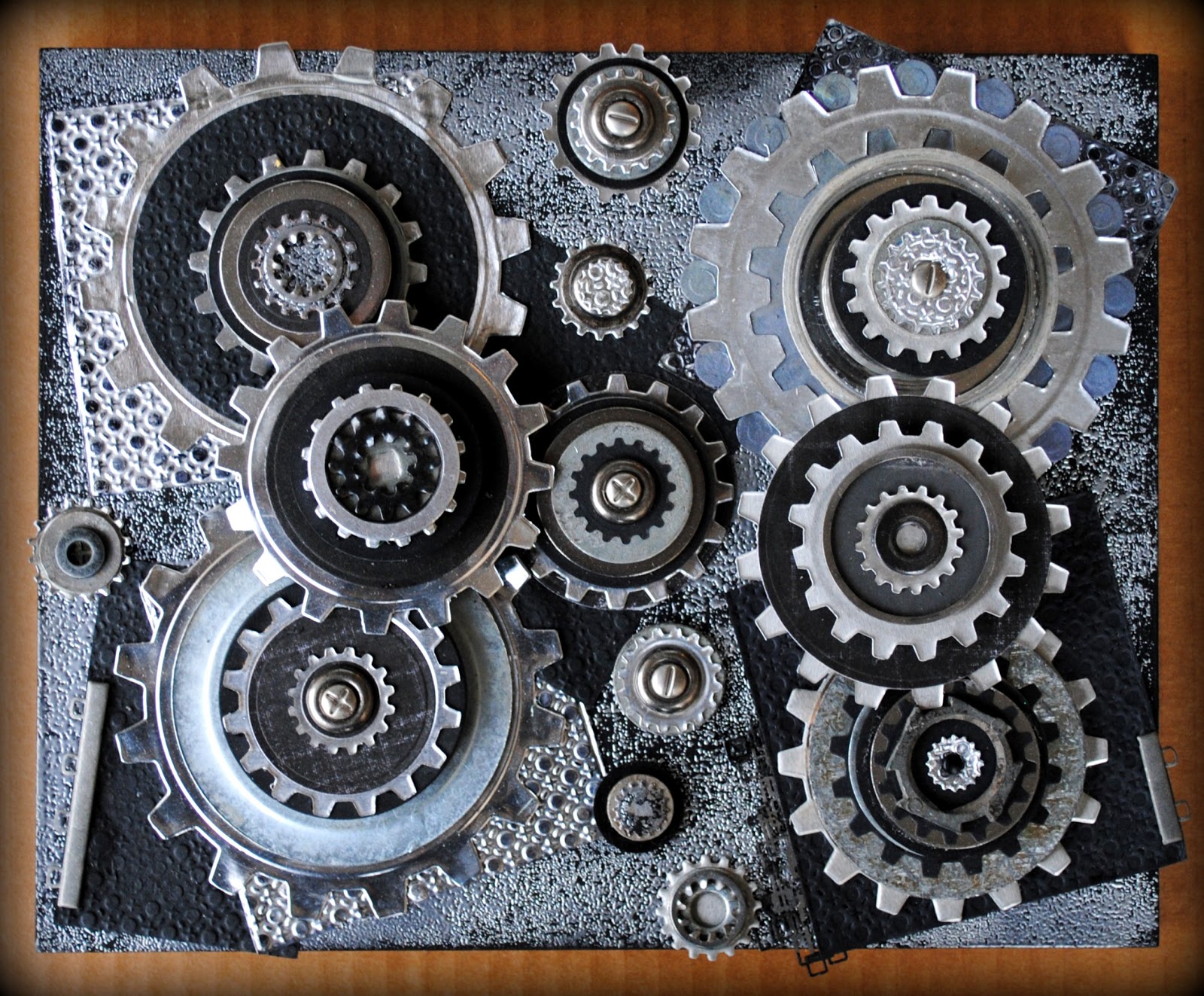 Lay out the sheets of embossed cardstock and Craft Foils, the “gear sandwiches”, and the assorted found objects on the wood panel. Be sure to stack the “sandwiches” for added dimension and let the embossed sheets overhang the edges. Attach with adhesive once the design has been selected.