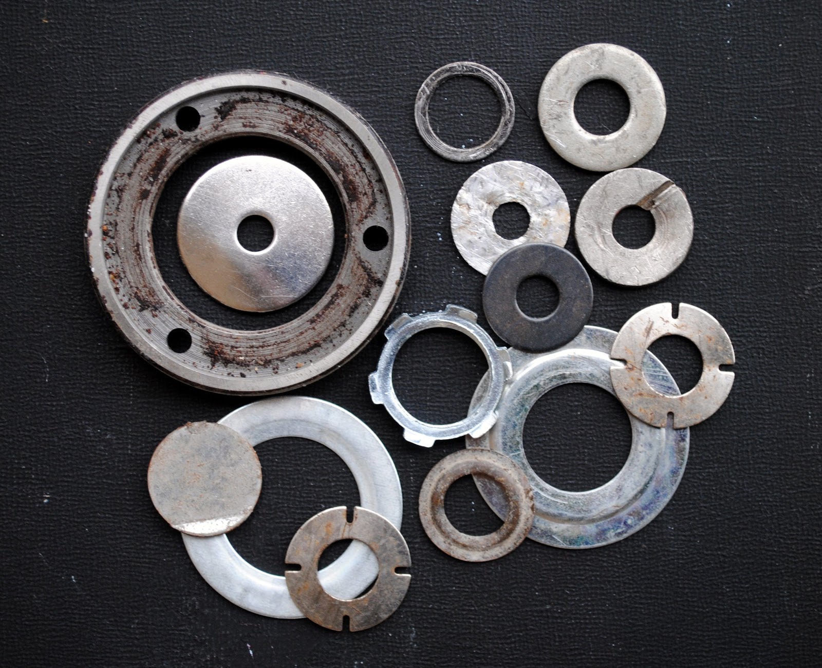 Gather small, flat metal found objects, brads, and additional supplies sourced from the hardware store and from your own collection of found objects: assorted sizes of rubber, plastic, and metal washers (cup, fender, flat, serrated, star lock, etc). Chose the objects based on size and color. For the purposes of this project, hardware was limited to shades of silver, black and gray.