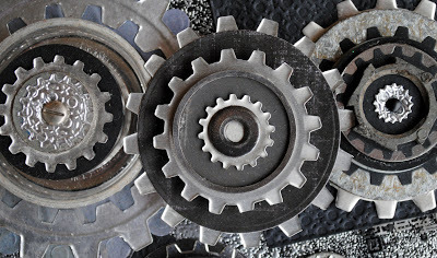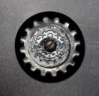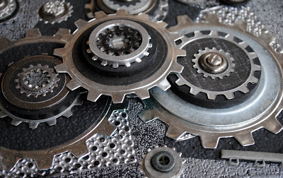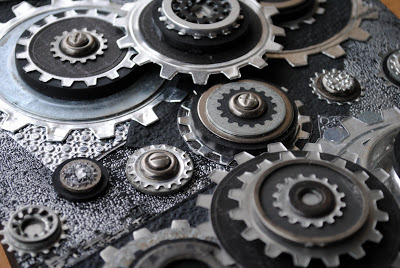 Create “gear sandwiches” by stacking the die cuts, flat found objects, and hardware. Insert brads into the spaces of the uppermost part of the sandwich. Once designed, glue the stacks together.