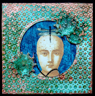 Other: cardstock, book board, copper sheeting, patina solution, black gesso, acrylic paint, decorative paper, original photograph, dry transfer, PVA adhesive glue, scissors.