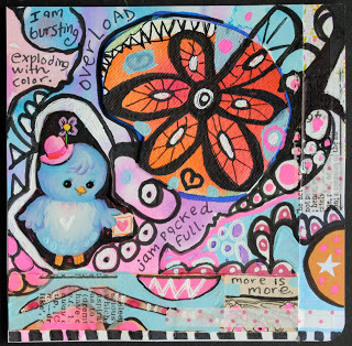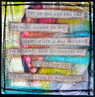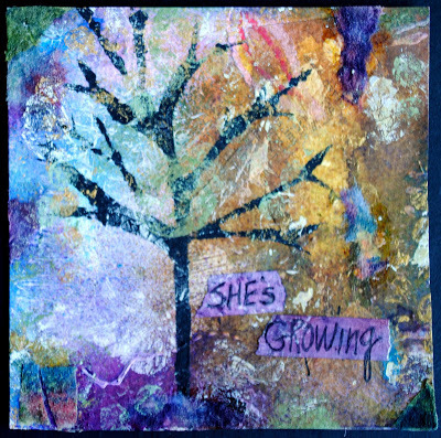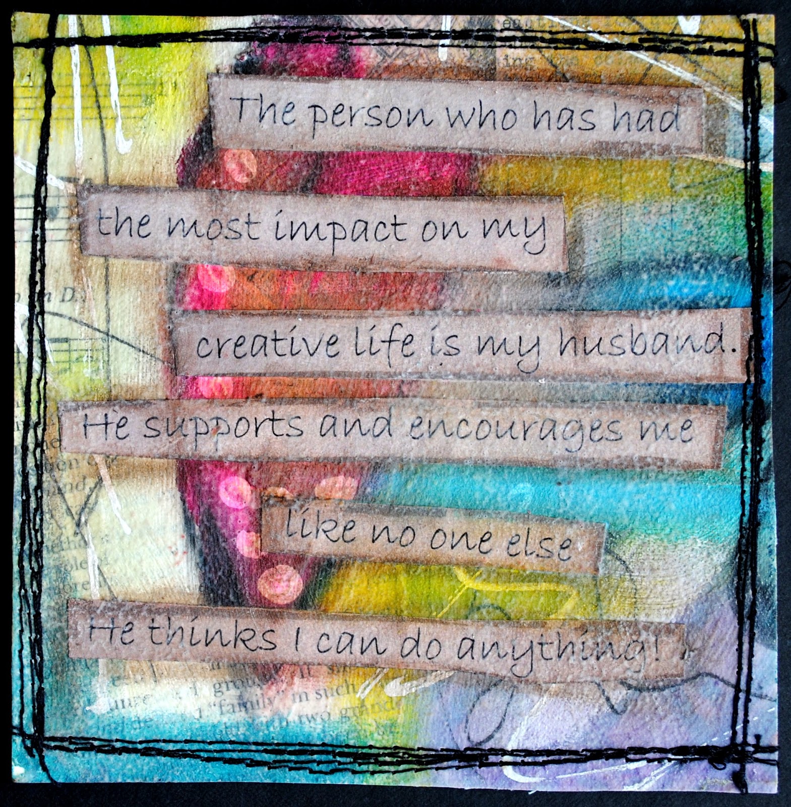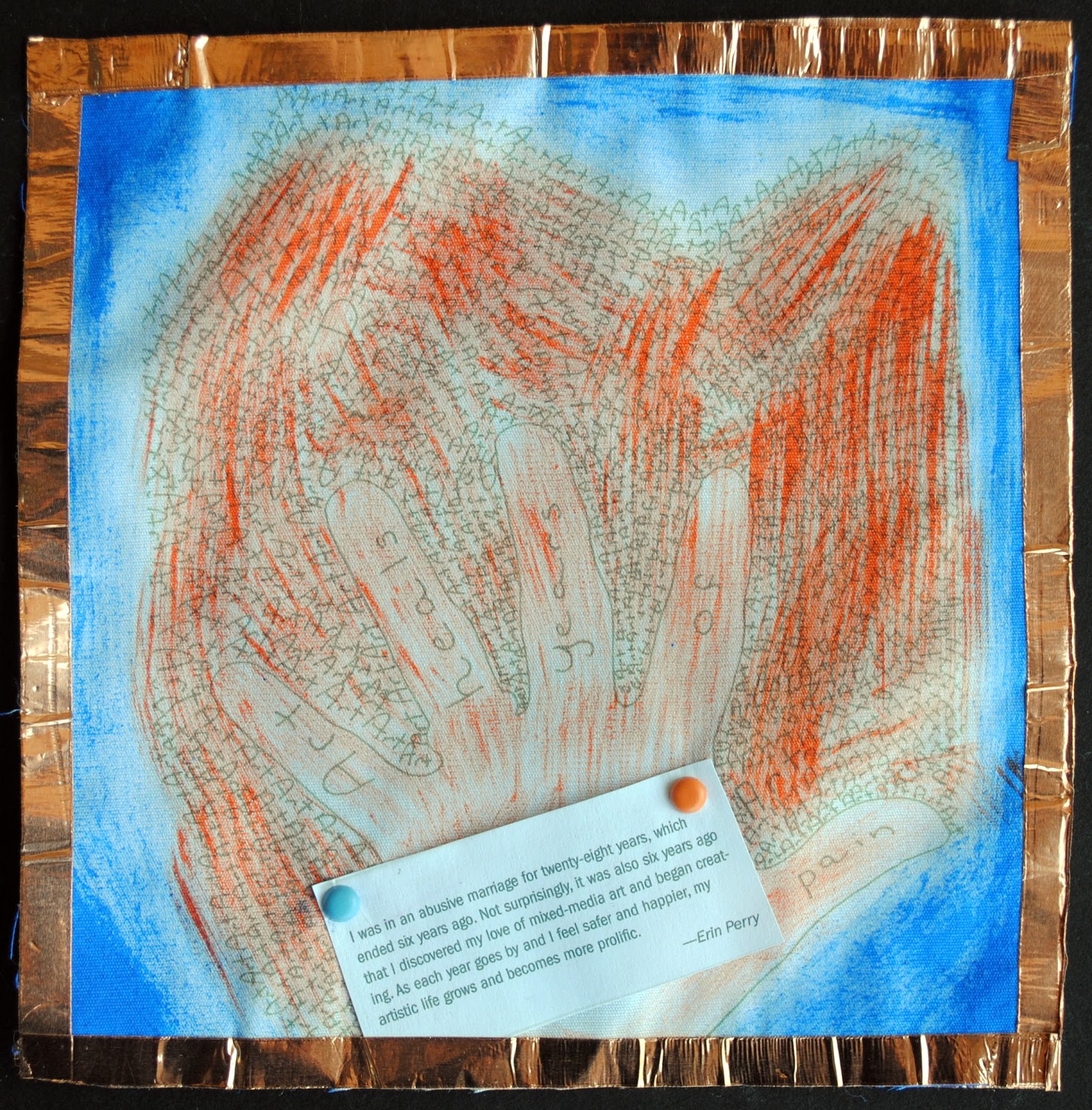 "I was in an abusive marriage for twenty-eight years, which ended six years ago. Not surprisingly, it was also six years ago that I discovered my love of mixed-media art and began creating. As each year goes by and I feel safer and happier, my artistic life grows and becomes more prolific."