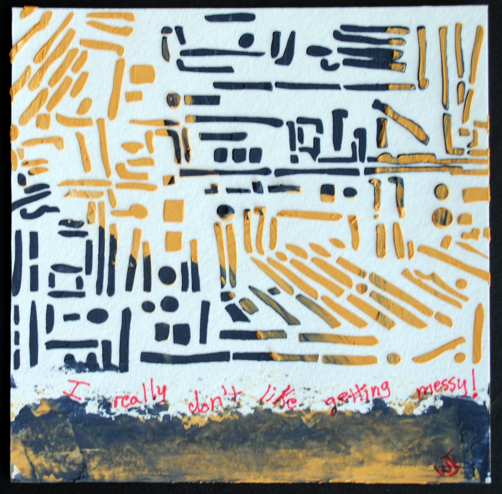 "I have a story to tell you and the words are as important to me as the art is. My art would whisper this woman is on overload. Beware it would point out that I'm a lover of color and texture and that smearing paint cures all of life's woes."