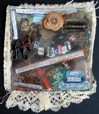 "As a collage artist I use many different materials in my work...the old and the new, the precious with the rusty street finds, the unexpected...creating work that is whimsical and at the same time filled with reverie and discovery and that is so intensely personal to who I am. If my art could speak, it would express the joy it experiences at becoming a visual image of my being...of my soul."