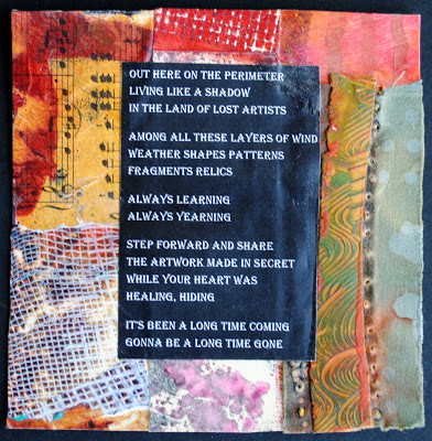 "there are times. it brightens everything up. mixed media. strongest footprint. grunge. magical tales. dreams. celebrate. and found objects. fun and playful. layering. humor. arty. textures. really fun. inner journey. it's different when the words are coming through you. invoked miracles. organic art. embracing. you. search for meaning in our lives. play. a mirror for personal experience and breaking boundaries. the world in which we exist."