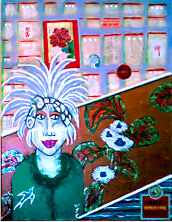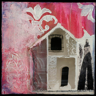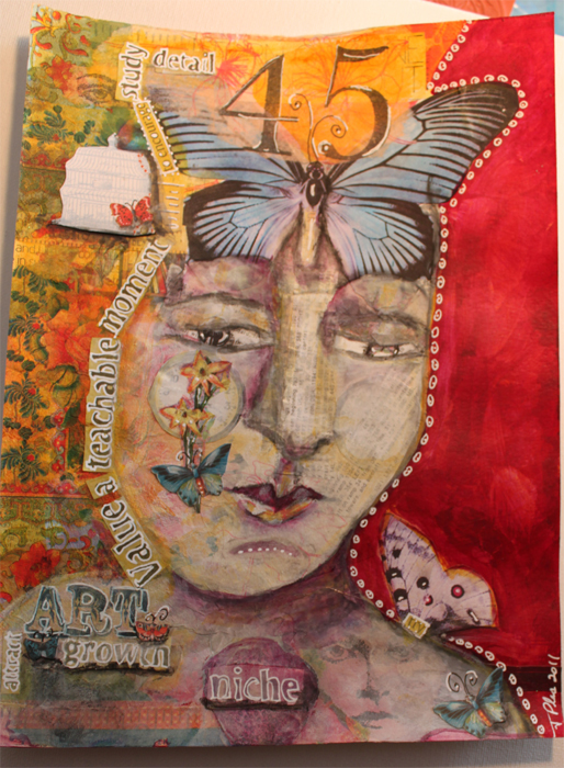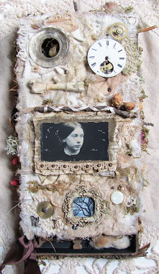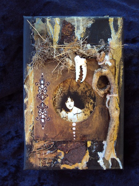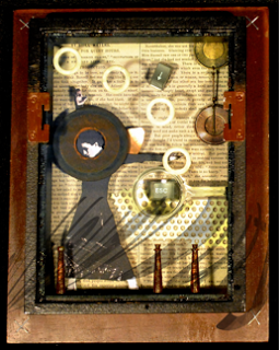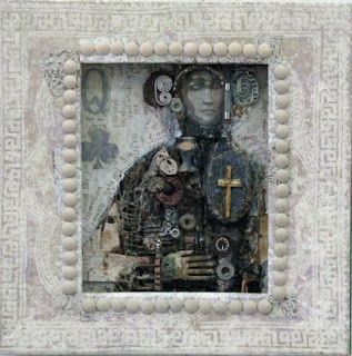 "I rather like this piece because it sat around my studio and I just layered and layered onto it. It started out as a Lynne Perrella inspired, but unused, piece for a magazine article. Then Kari Holbrook sent me a package of bits and pieces and I stuck them on and painted over everything. Then her husband, Mike, showed me how to cut the 'frame' and it became a shadow box. In New York I picked up some more pieces and added them. THEN I pulled off the top layers and started over. I added more and glazed over them. By the time I stopped I was rather fond of this queen."Adrienne "Dree" Berry