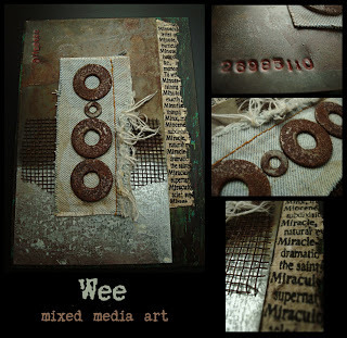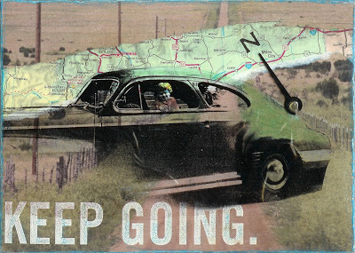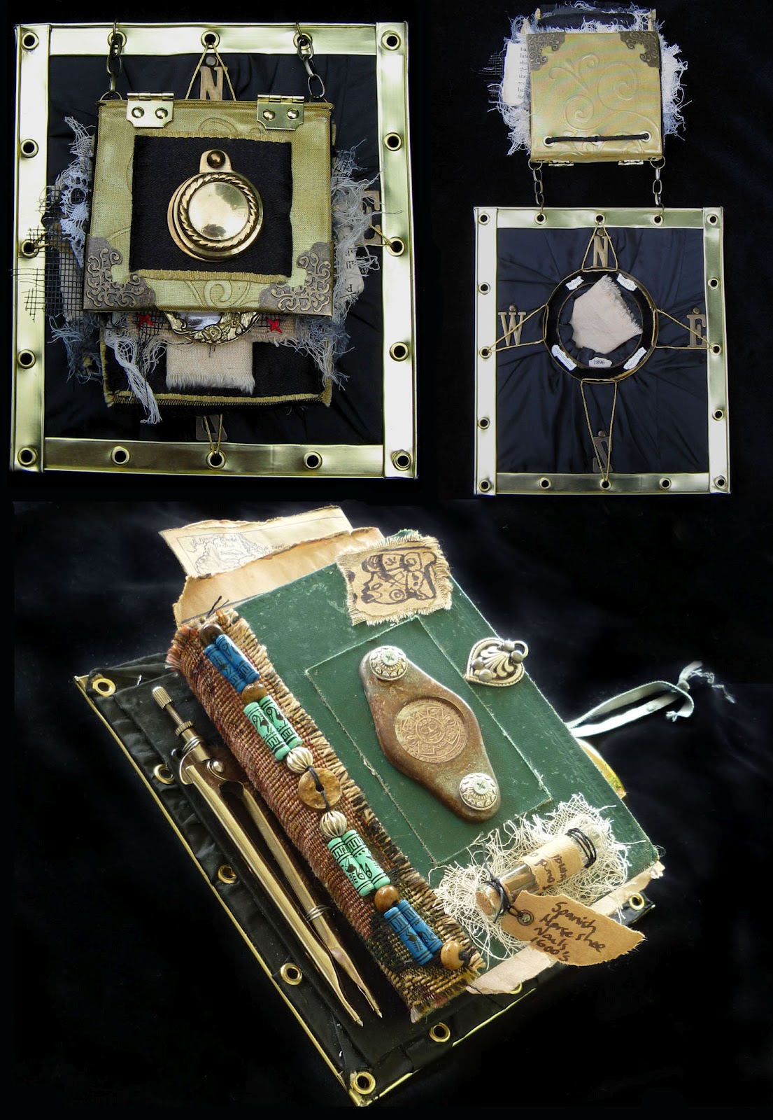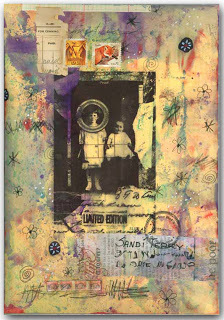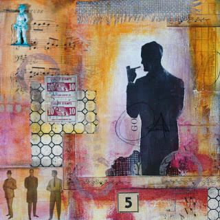), which is very personal and full of self reflection. It came together quickly, as with many of my meaningful pieces - I have to turn off my brain and allow serendipity to take over. The graphic element under the '10' stamps is dollhouse flooring symbolic of foundation for me. The screen at the top is from a door my husband replaced so I feel a family connection. Underneath the cowboy you see the musical word 'Etude' but I have crossed out the 'E' so that 'tude' is showing to symbolize my attitude in trying to achieve against the odds - a self taught artist at the 10 year mark writing a book, geez, who would have thunk? Same with the 'Go'. On the far right I have circles the word 'Solo' which is from a vintage pilot's log. The three men and the number five are also personally symbolic."------------------------------------------