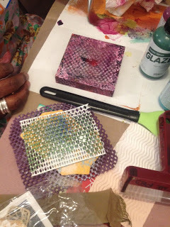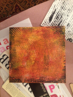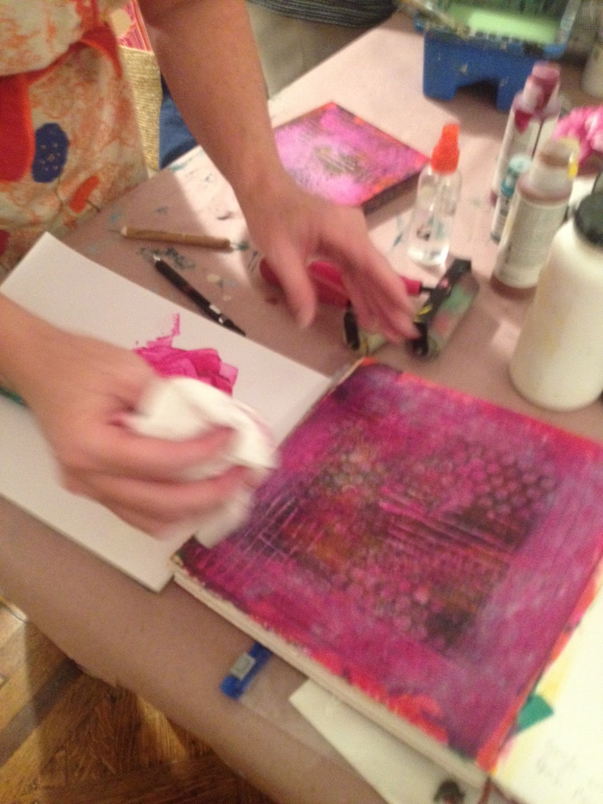 The workshop was all about working small but with a big impact. Using wood cradled panels as the substrate, layer upon layer of texture and color was created...