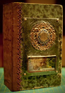 "This is my 365 Grateful project and the book I made to house my daily photos. One of my favorite pieces - this week. It's not that large - about 6" by 9"- but it's 3 inches thick, with two days' photos on a page! I like the feel of this book in my hands, the image of the girl stopping to smell the flowers and the combination of an old book cover, metal elements and waxed linen thread. I like knowing that this book will hold a year's worth of gratitude, and my heart will hold the fresh perspective that the exercise brings."Pam McKnight