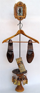 "Julie's Dream is made up of components that remind me of people and different times of my life. The wooden house part is from an elaborate birdhouse constructed by my late uncle. The horse and its china wing were given to me by a friend names Julie. There is a tintype from my antique photo collection beneath the magnifying glass. The chain is like the chain of swings from years ago. It's made with objects that evoke happy moments from the past."Darlene AkAHugGeR Wilkinson