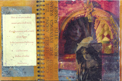 project. 'I count myself among the blessed for evening squandered drunk with sunset' is my personal prayer for gratitude for life, with all of its curses and blessings. I used a combo of techniques - image transfers, metallic paint, rubber stamps, transparencies, and attached a stitched booklet of a few stanzas by other poets, including the following lines of Emma Lazarus from her poem The New Colossus:Here at our sea-washed,