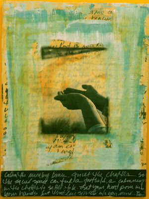 "Sanctuary, this was quite a departure from what I had been doing, but also came directly from journal explorations. It is a photograph of my daughter's beautiful hands and was done for a show that I ended up being rejected from but took such inspiration from the prospectus which had to do with creating sanctuary that it sparked many other works.------------------------------------------