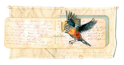"This is a piece from a series called Forget Me Nots. Each piece incorporates a page from a vintage autograph album. The words are both beautiful and haunting, as well as a perfect bit of texture to a rather stark background. A pop of color is incorporated through the addition of the painted bird subjects. These images are symbolic in meaning, as birds represent flight and freedom, reinforcing the idea that our words have wings.Martha Marshall