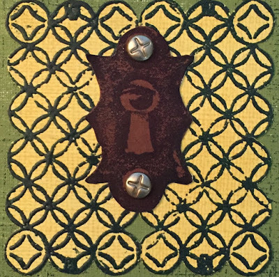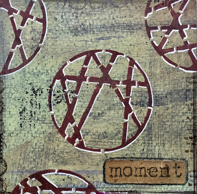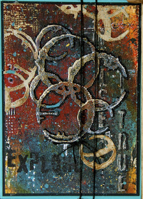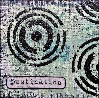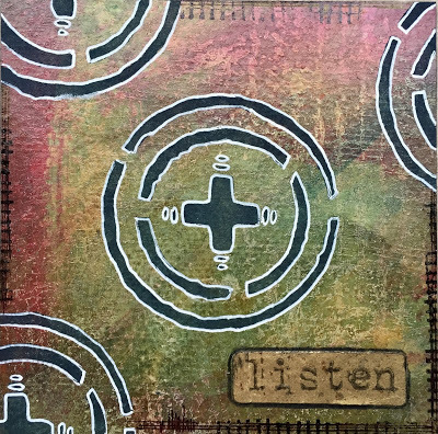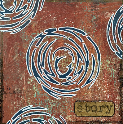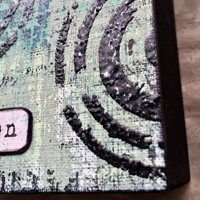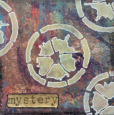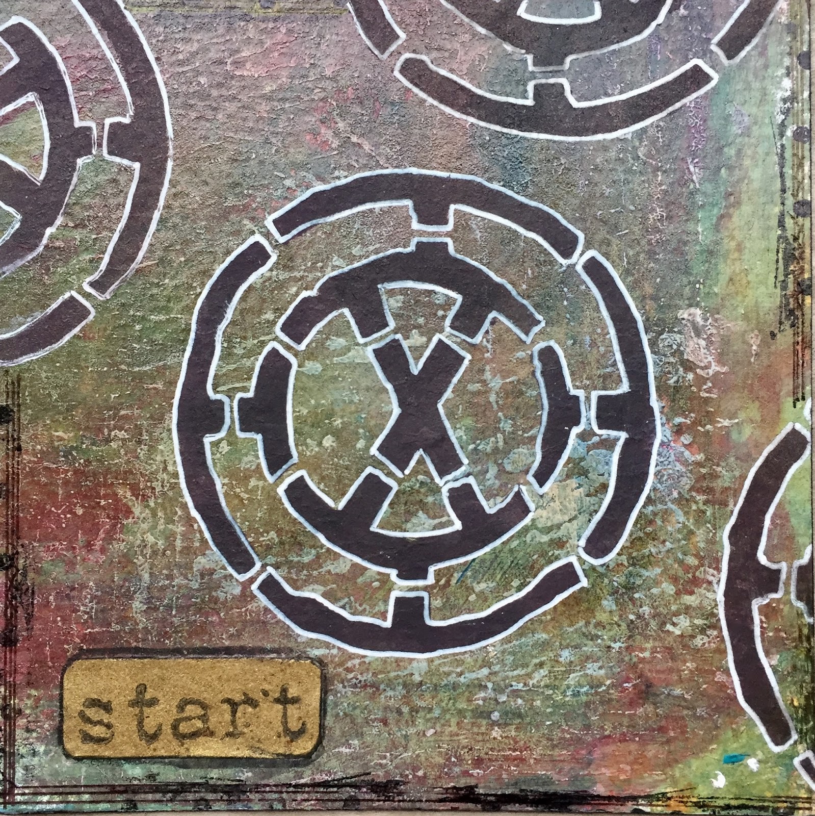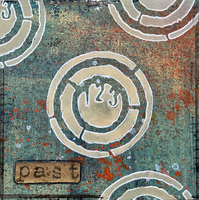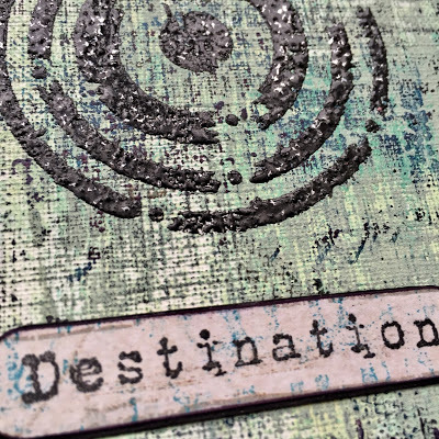 This artwork is an example of combining heat embossing with stenciling, using Rocky Road Baked Texture and my Techno Circle stencil from StencilGirl Products.