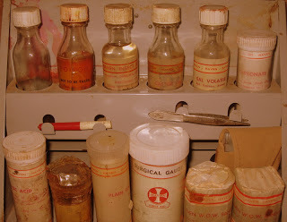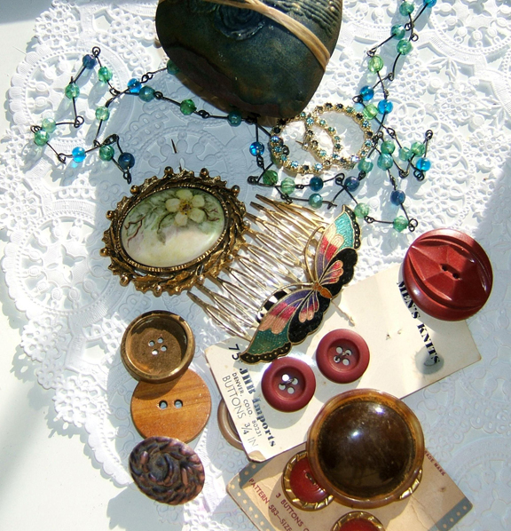 "This is a still life of some of my favorite things -- undamaged Frozen Charlottes, a Victorian era doll and head, vintage watch parts, nature bits and some of my small animal skulls."------------------------------------------