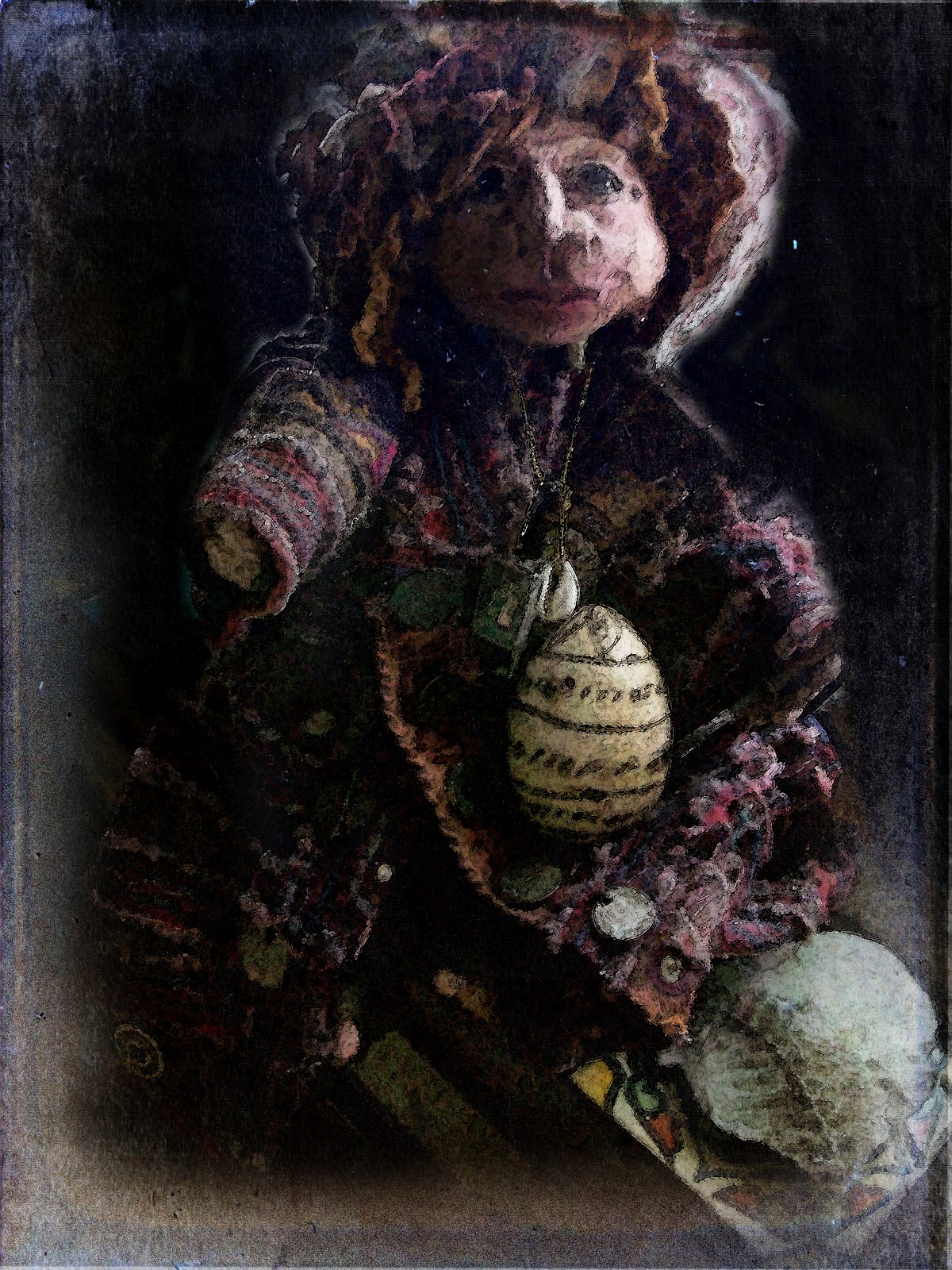 "Here's a puppet, stone egg, and fossil. A little dark and a little Pollyanna (lol)."Marsha Jorgensen