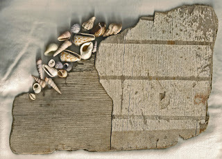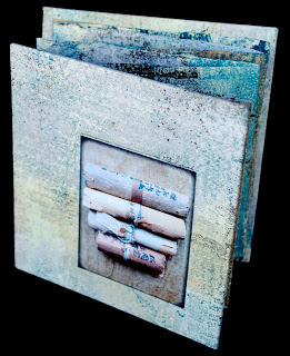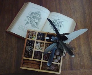 "The small rough built box contains a variety of seeds, resin and leaves from aromatic trees including juniper, cypress and cinnamon (the aroma is just wonderful), along with some small part of my bird feather collection. The box is resting on a vintage book from the early 1870's on the natural world and sits on the old black bean timber table in my studio."Patti Edmon