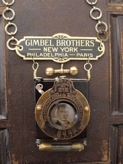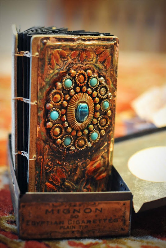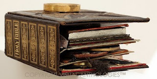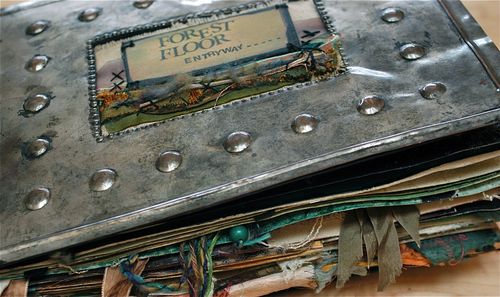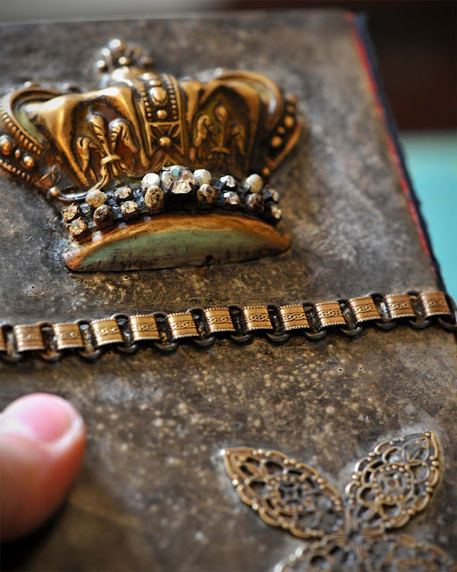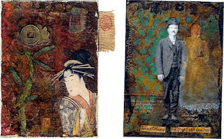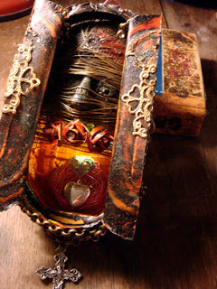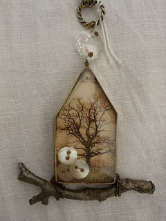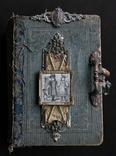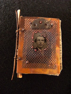 ------------------------------------Jen's blog is called A Mark in Time and I think that is the perfect name. Her artwork conjures up a sense of history, mystery and intrigue. Each and every piece seems to have its own story to tell and seems to capture a moment in time. Her list of ingredients include pieces of metal, sometimes rusted and sometimes etched by hand, vintage tintypes, assorted found objects, and the like. Her creations, whether miniature books, assemblages or jewelry all call my name.