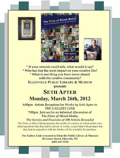 I will be in the Hudson Valley in New York at The Gallery Link within the Ellenville Public Library and Museum. I currently have an exhibition of 12 new paintings and 9 new mixed media works on display at the gallery. Also included within the show is the following interactive piece that will hopefully be filled by the end of the night.