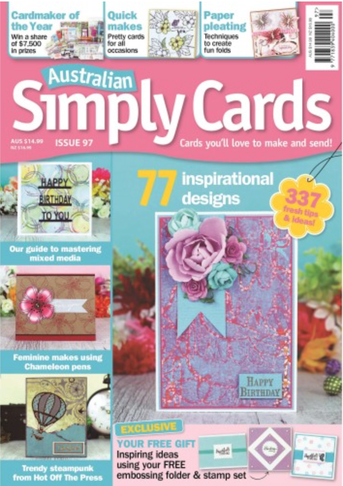 Linda had a six-page spread (and cover shot) featuring my Spellbinders collection in the August 2016 issue of Australian Simply Cards. Good on ya Linda!