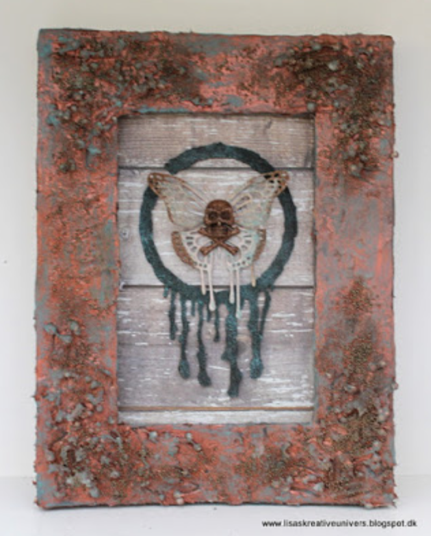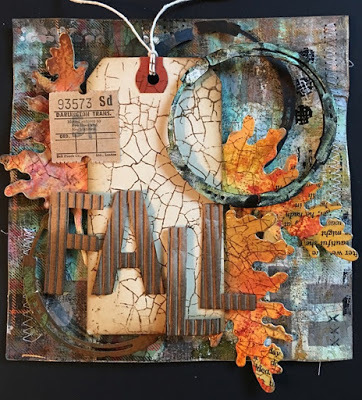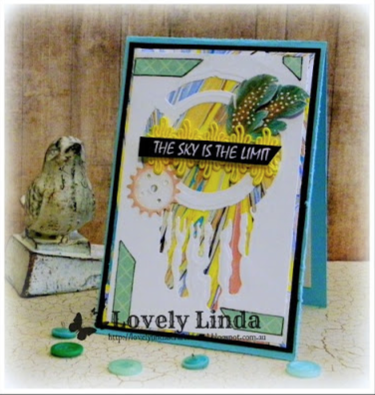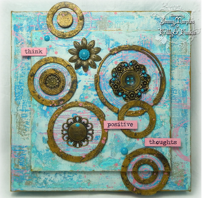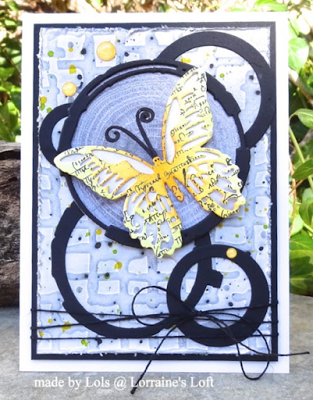 (Impression Obsession Screen Print Stamp; StencilGirl Inside Out Stencil; Spellbinders Coffee Ring Die Set, Drip Drop Die Set)(See a full tutorial for this piece here)Lorraine Aquilina