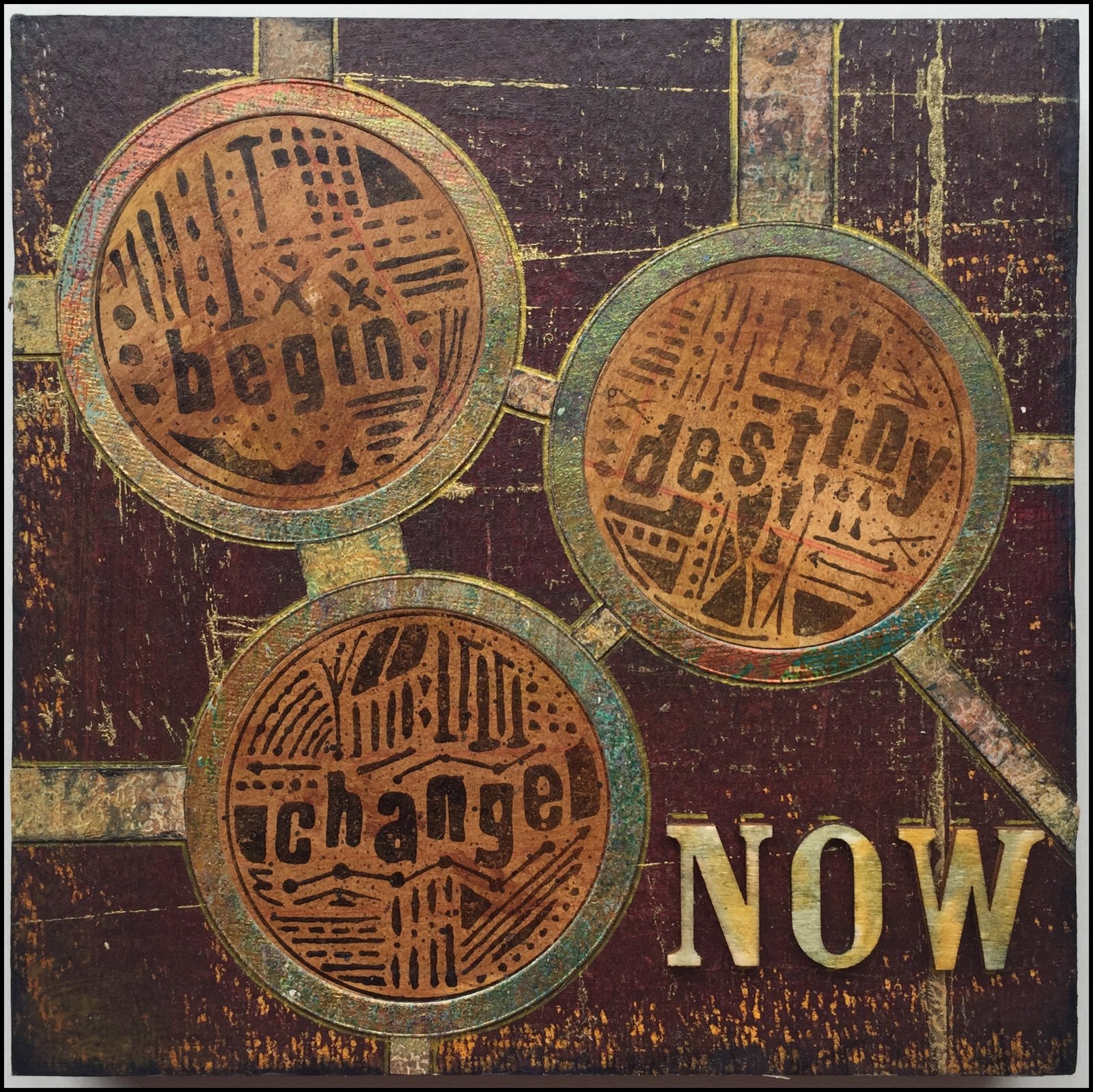 (StencilGirl Now is The Time Stencil, Inside Out Stencil; Impression Obsession Screen Print Stamp; Spellbinders Robo Ring Die Set)Linda Lucas
