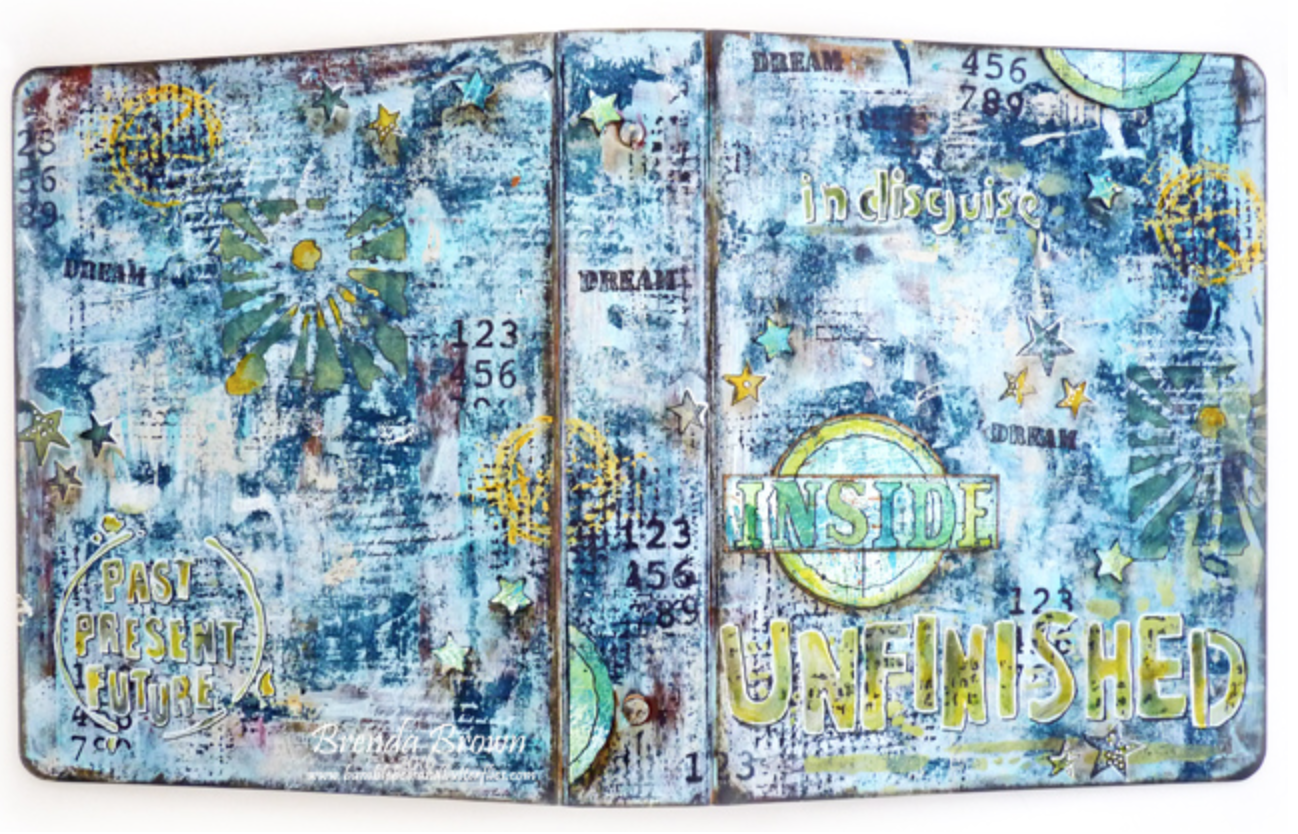(Spellbinders 3-Ring Binder; Impression Obsession Password III Stamp Set; PaperArtsy Eclectica 01 Stamp Set; StencilGirl Unfinished Stencil, Urban Square Stencil, Past Present Future Stencil)(and click here to see how 4 other artists decorated this same binder)