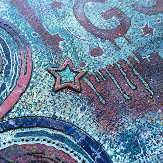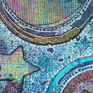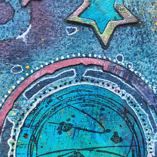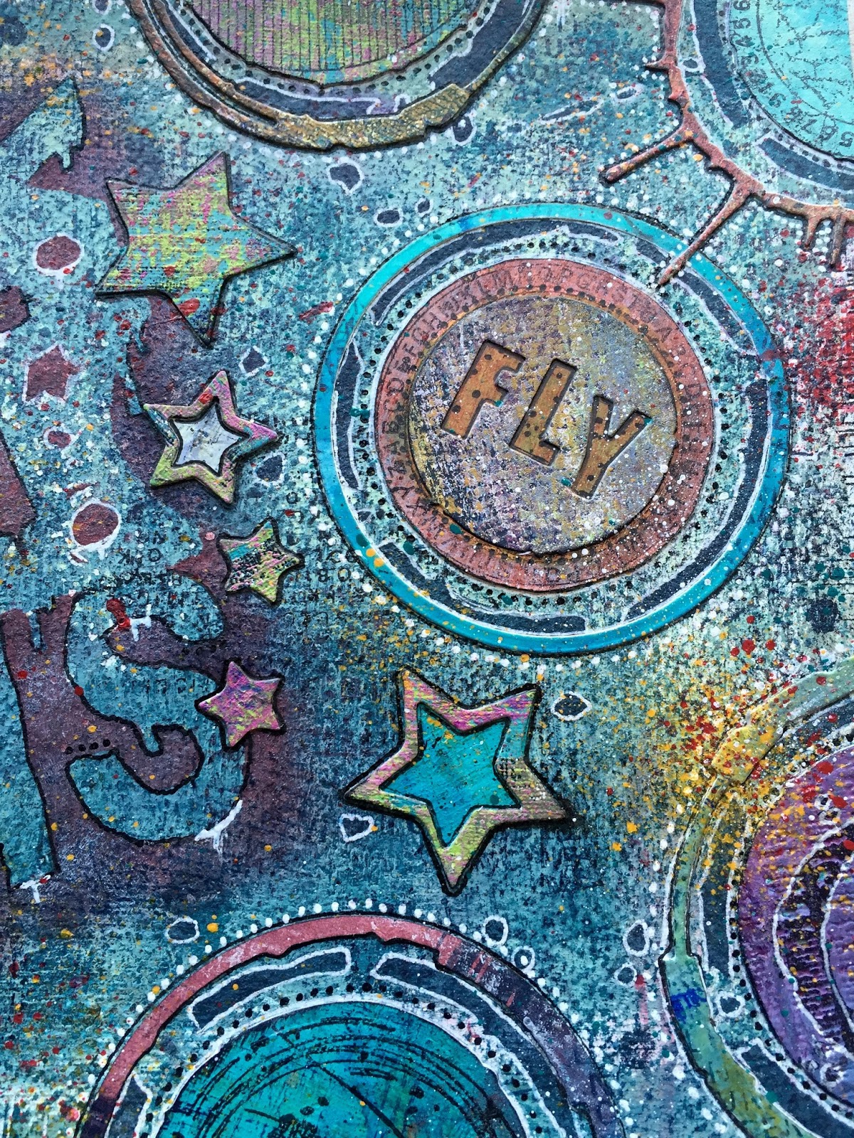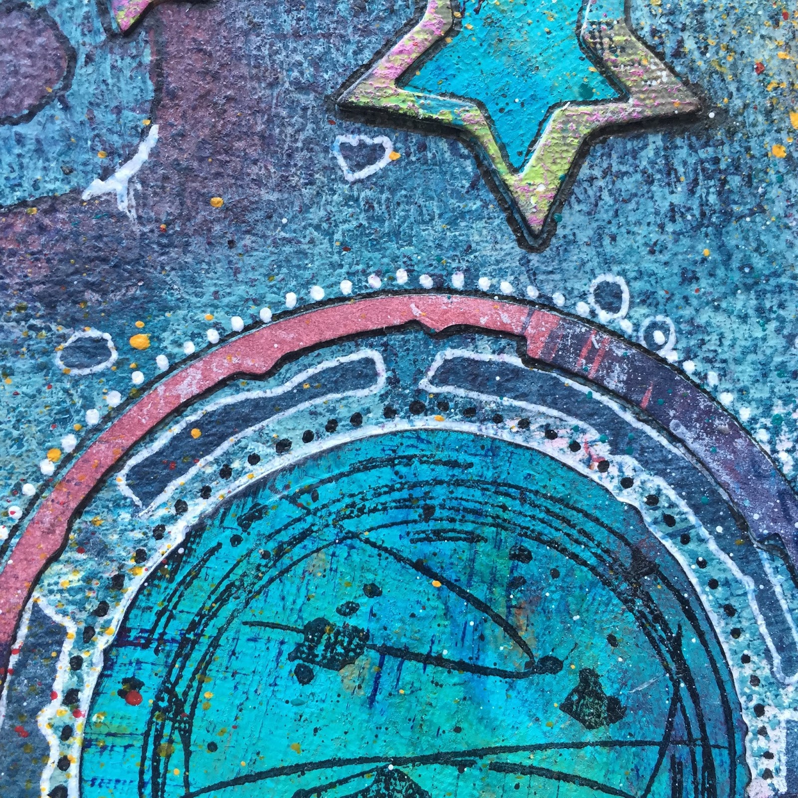 Within and around these stenciled circles, I layered both hand painted paper circles stamped with a number of my circular Impression Obsession stamps and hand painted loops and circles, die cut using an assortment of my circular dies from Spellbinders. I also added die cut stars as well. I used black and white gel pens to add outlines and marks to the layers.