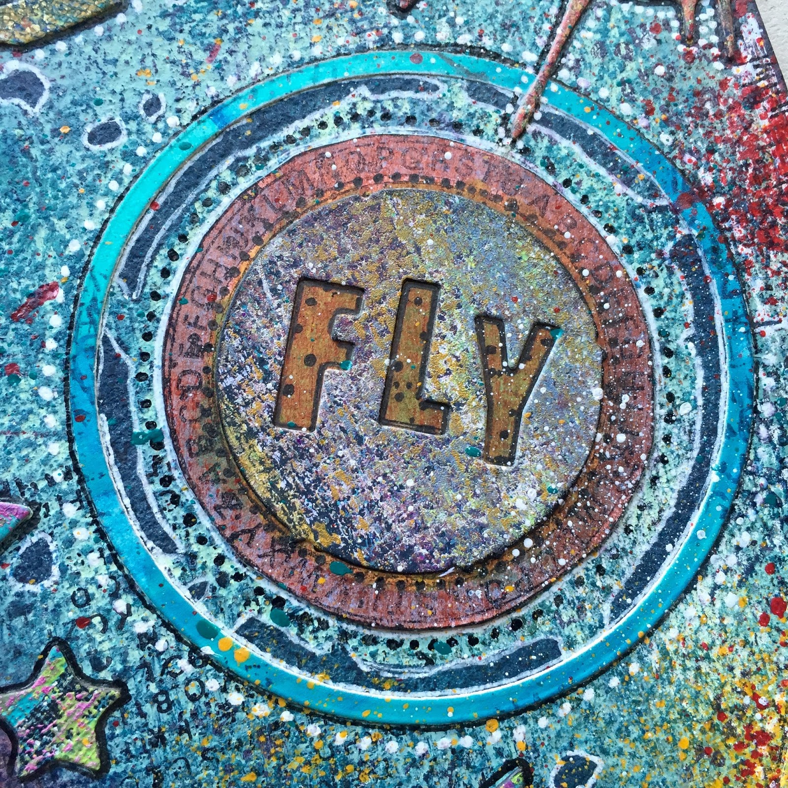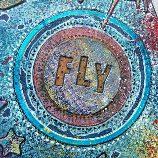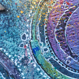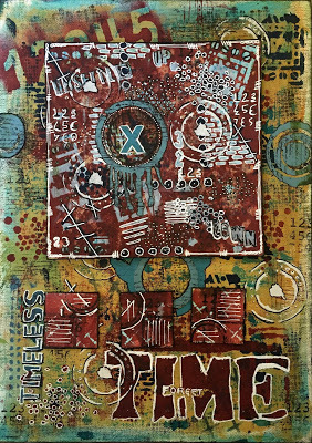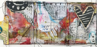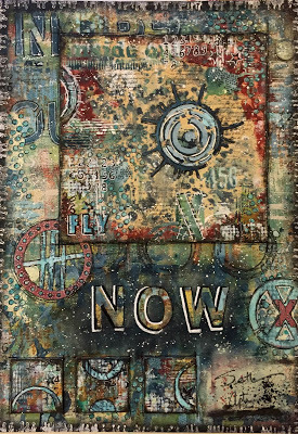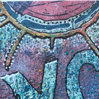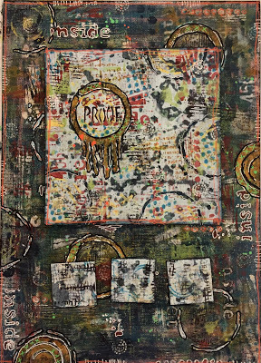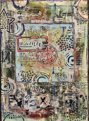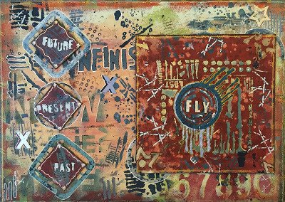 Fly ByThis piece is all about layering. Starting with a 9x12" sheet of watercolor paper, I slathered on layers of PaperArtsy Fresco Finish Chalk Acrylics. I knew I would eventually be making marks on the painted surface and these paints accept every pen I have ever thrown at them. I randomly stamped the surface with Impression Obsession stamps to add extra design and dimension.