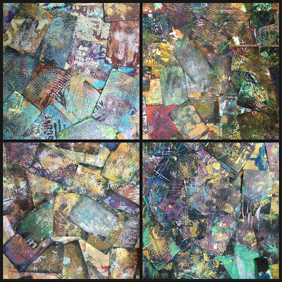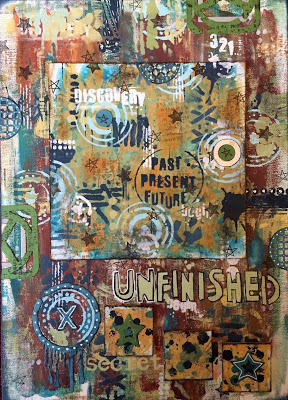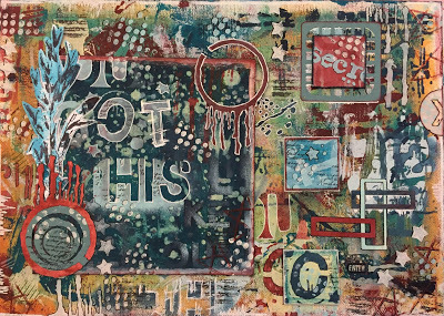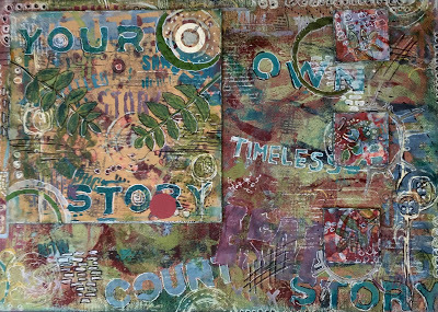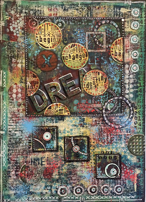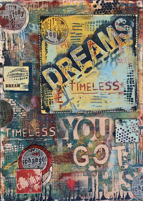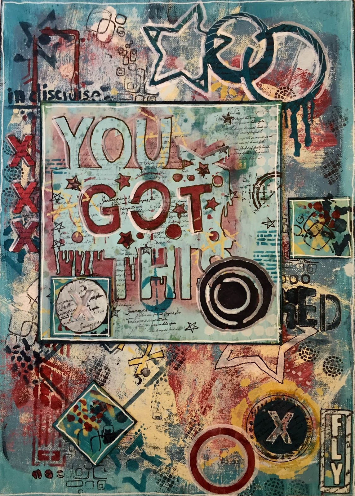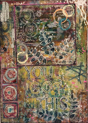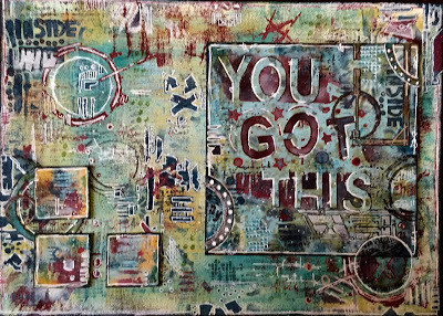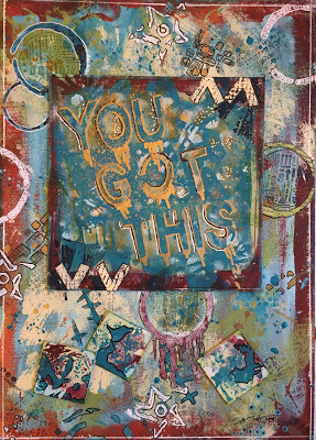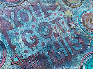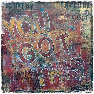 I love text and decided to start this piece by pouncing several colors of paint and ink through my 6x6" You Got This stencil. There is also a newly released 4x4" mini version of this stencil as well. The main color used was Mahogany - one of the four colors in my own limited edition set of PaperArtsy paints.