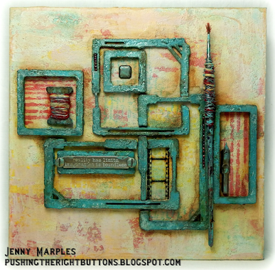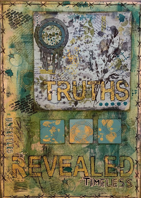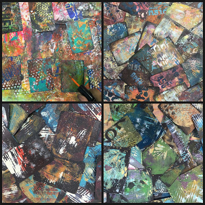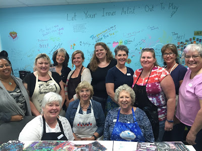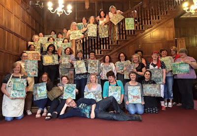 The class was developed especially for the event but is most similar to my Mixed Media Mashup workshop. Everybody used the same supplies: PaperArtsy Paints and Stamps, Spellbinders Die Cuts, and StencilGirl Product Stencils. And yet, everybody's artwork was uniquely their own, as you can see below (sorry to those artists who have canvases I did not photograph).