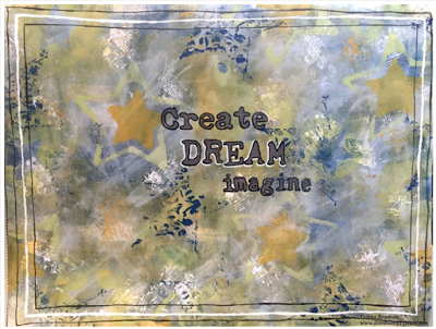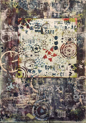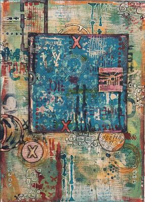 This piece is all about layering. Starting with a 9x12" sheet of watercolor paper, I slathered on layers of PaperArtsy Fresco Finish Chalk Acrylics. I knew I would eventually be making marks on the painted surface and these paints accept every pen I have ever thrown at them. I randomly stamped the surface with Impression Obsession stamps to add extra design and dimension.