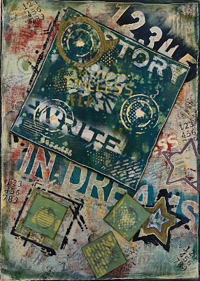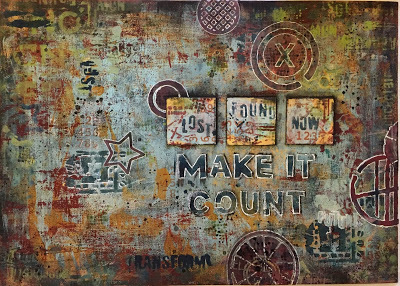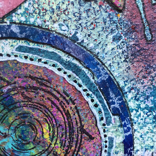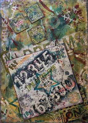 After this, I got to layering. I started by pouncing Midnight, a second color in my PaperArtsy paint set, through the circle stencil that is part of my large, Urban Outsiders stencil. Forgot to take a picture of this, but here is the stencil used on another background.