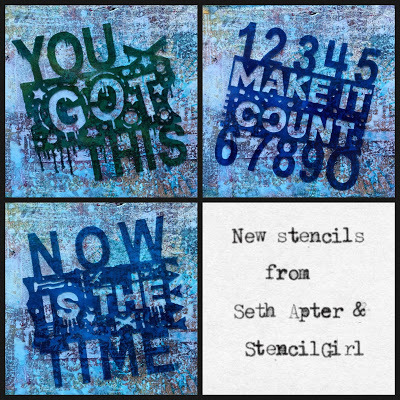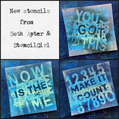 These stencils - as well as the same designs in 6 x6 inch size - are available as a preorder now in my online shop (shipping within the next week) or at StencilGirl Products.