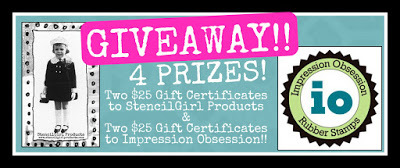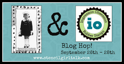 The blog hop takes place from 9/26 to 9/28. StencilGirl Products and Impression Obsession are each giving away two $25 gift certificates. To be eligible to win one of these four prizes, leave a comment on any post in the blog hop. If you visit every participant and comment on each blog, you will have more chances to win! Giveaway closes on 9/30 at 11:59pm Central Time. Winners will be announced 10/2 on StencilGirl's Facebook page.