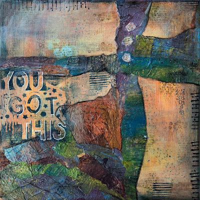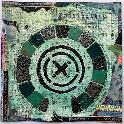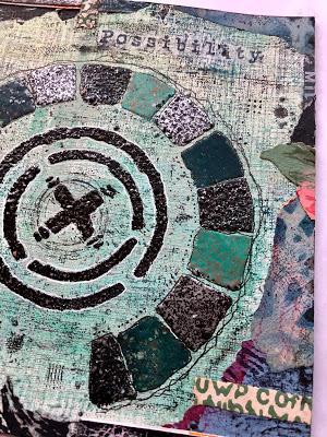 Collage and much mark making were then added to the surface. The word Possibility, from my new Impression Obsession Journal Jargon 5 stamp set was the finishing touch.