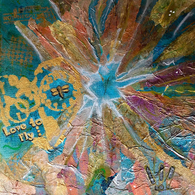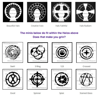 My contribution to the hop was created using one of my all-time favorite stencils, Creative Halo designed by Pam Carriker. She has 4 stencils in her Halo series and by total synchronicity, my mini circle stencils fit inside the halos, given you many more creative options.