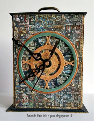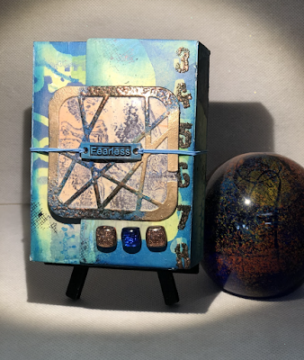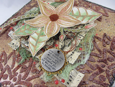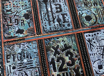 My stencil was then embossed with Rocky Road Baked Texture and the squares in the halo were embossed with Deep Sea Baked Texture, Patina Oxide Baked Texture, Rocky Road Baked Texture and Hammered Metal Embossing Powder.