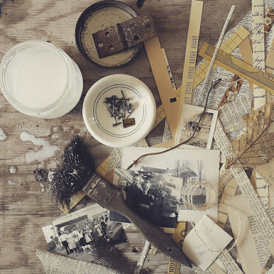 My diluted Elmers glue solution applied with my simple chip brush. I like using Elmers diluted with just a little bit of water when I am working on my collage pieces. It stays wet for awhile so you have a little flexibility in moving bits around. You don't get any bubbles/creases/burps. And I love the fact that it is so affordable.Deborah Guthrie