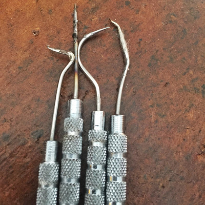 My dental tool set I bought from Harbor Freight for less than a dollar! I use them in every line of work I do. I pull bubbles out of resin with them. I ream beads with them. I use them to create textures in polymer clay. They are great for positioning and moving around tiny collage parts. And I use them for making marks in wet paint as well. Gwen Lafleur