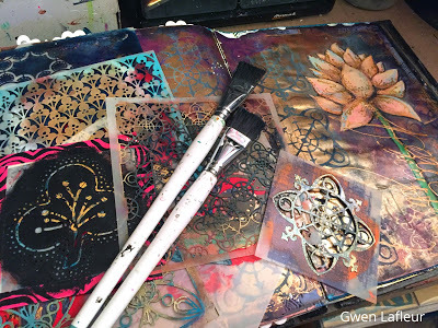 Stencils. For years they have been my go-to-tool for adding pattern, texture, depth, dimension, and more to my work. I've used them for everything from creating simple patterned paper to to making the base for an armature for a sculpture. They can hide in the background and layers of my work so you don't even know they're there, or create a fantastic foreground or focal point. I love that you can stencil with all or part of them, use them with nearly any medium, or completely change the look by m,modifying the application method.Kim Henkel