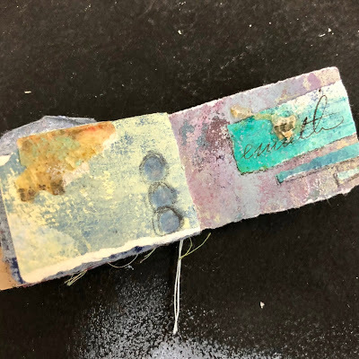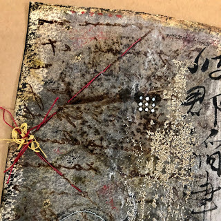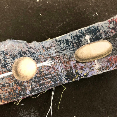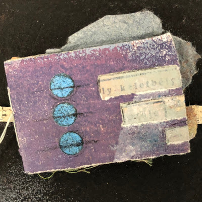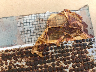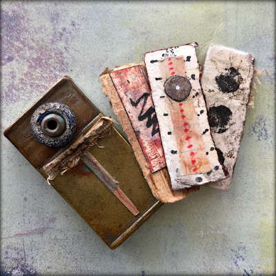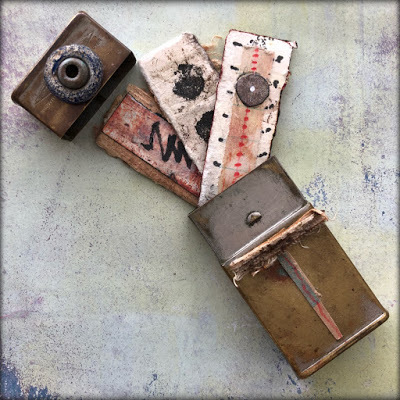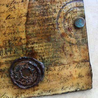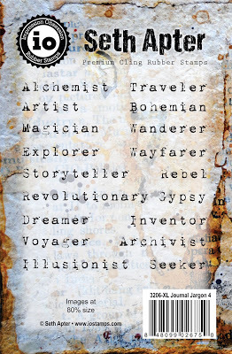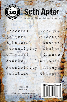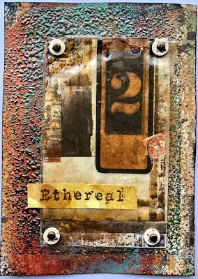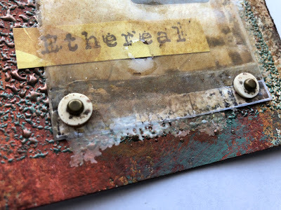 I attached the skin to the paper using brads - and sandwiched thin beads in between for added interest. I also stamped the word Ethereal, from my new Impression Obsession Journal Jargon 5 stamp set, and slipped it under the skin for an extra detail. I adhered this to a slice of watercolor paper that was painted and embossed with my Patina Oxide Baked Texture.
