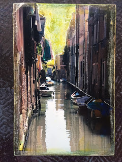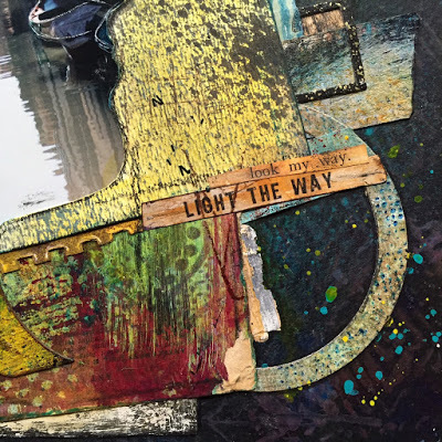 While I understand the symbolic meaning of the quote, I chose a photo that interpreted it a bit more literally. I took this picture in Venice when I was there maybe 10 years ago. I thought that the shadows and reflections in it suited this project very well. I hand altered the photo using an awl, sandpaper, and dye ink.