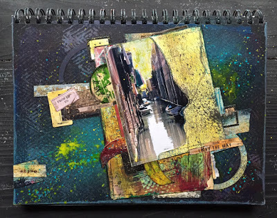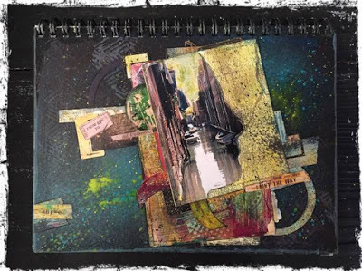 The fun really began at that point as I dug into my stash of painted paper, ephemera and collage material and made this mess. I went with my creative gut, chose a bunch of pieces -- many of which were small scraps which most people (other than us) would have thrown away along time ago -- and began layering. Once the collage was completed and adhered to the journal page, I outlined much of it with a black Stabilo pencil, added some stamping, and splattered a bit more acrylic paint to finish it off.