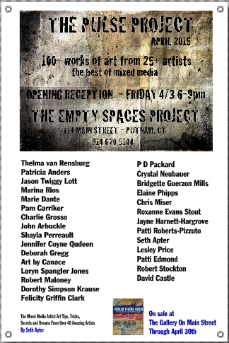 This past Friday, The Pulse Project opened at The Empty Spaces Project gallery in Putnam, Connecticut. The exhibition highlighted the work of 29 artists, all of whom were contributors to one of my two books The Pulse of Mixed Media and The Mixed Media Artist. The show runs the entire month of April.