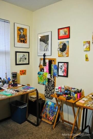 Martice Smith IIHere's a corner of my office. It shows my vision board with several exotic and patterned fabrics, notes, and gelli prints, tacked onto a cork board. On the walls are my framed illustrations and a sweet little postcard from a thoughtful friend, all the way from Australia. And yes, I use a TV tray as a table for my ink bottles.