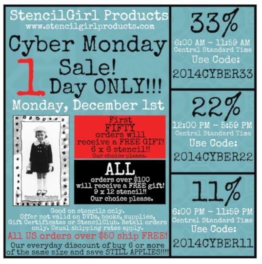 Today I want to let you in on a very special online event. One day a year, StencilGirl Products has extra special pricing on all the stencils on their shelves. That time is now. Well...almost now. On Monday 12/1 -- better known as Cyber Monday -- you can get deep discounts on your choice of stencils. And the earlier you shop, the bigger the savings.
