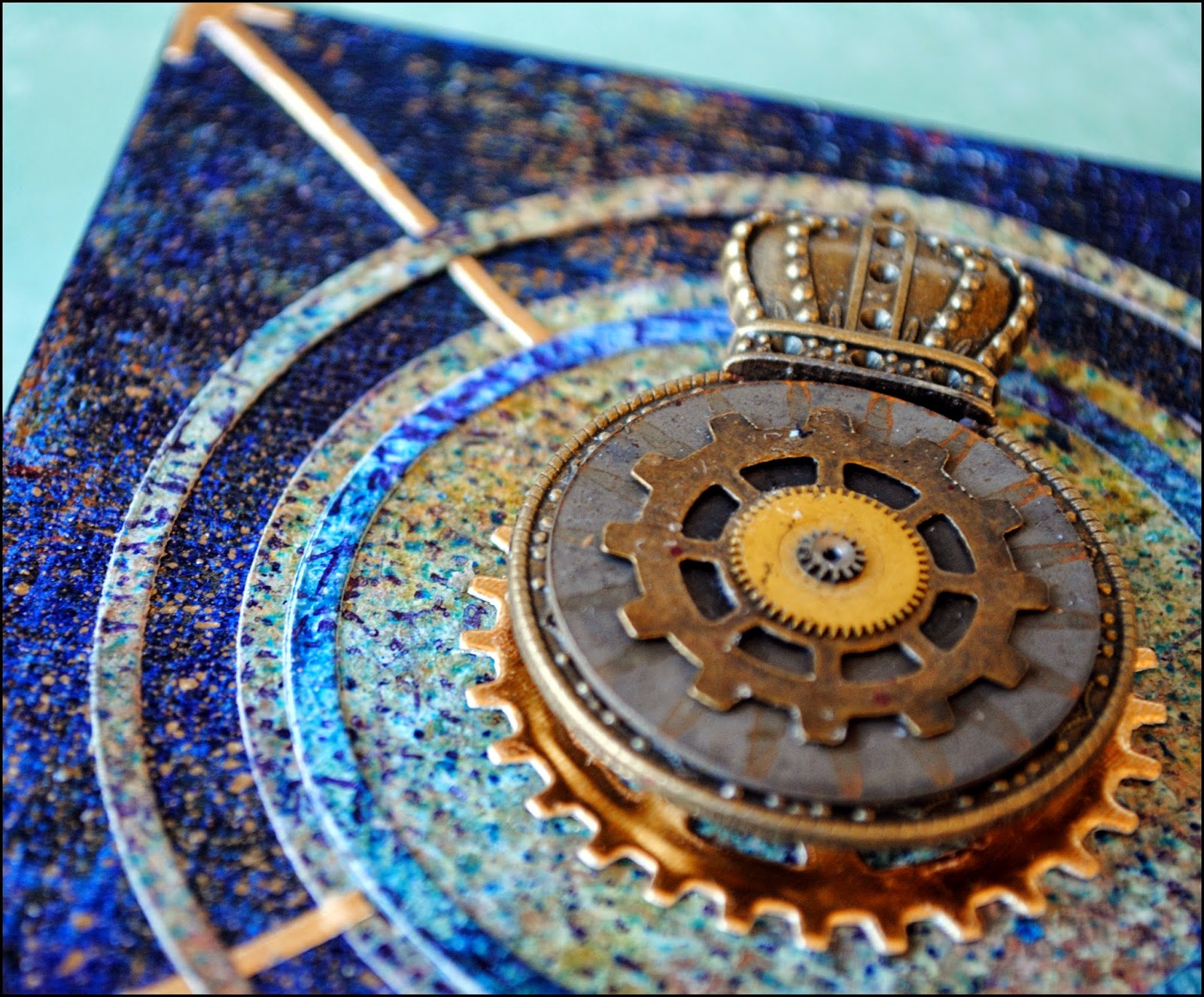 Once completed, I began to gather and create embellishments that I could stack below and within the pendant. First up was die cutting gold craft foil into a gear shape using the Spellbinders Sprightly Sprocket die set.