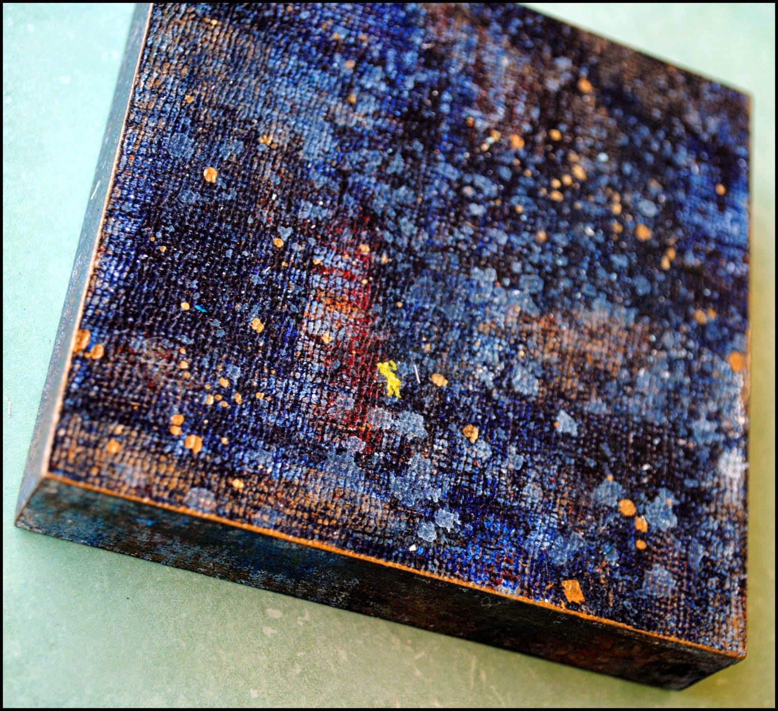 Starting with a 4 x 4 inch cradled wooden panel, I painted the surface with layers of gesso, acrylic paint, and acrylic glaze.