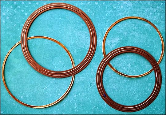 Given my preference obsession for circular design, I selected dies from Spellbinders Standard Circles die sets, both Large and Small. Combining one circle die from the Large set with the next closest sized circle die from the Small set allows me to create a ⅛ inch wide loop. I did this twice to create two loops of differing diameters cut from Spellbinders Precious Metals Craft Foil.